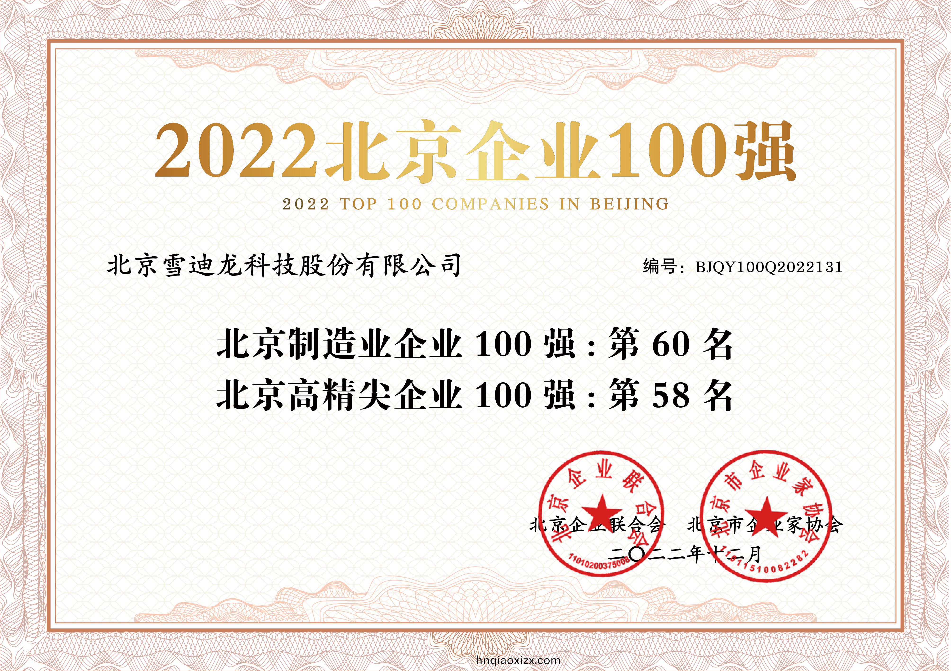 ● Selected as the top 100 manufacturing enterprises and the top 100 high-end and sophisticated enterprises in Beijing