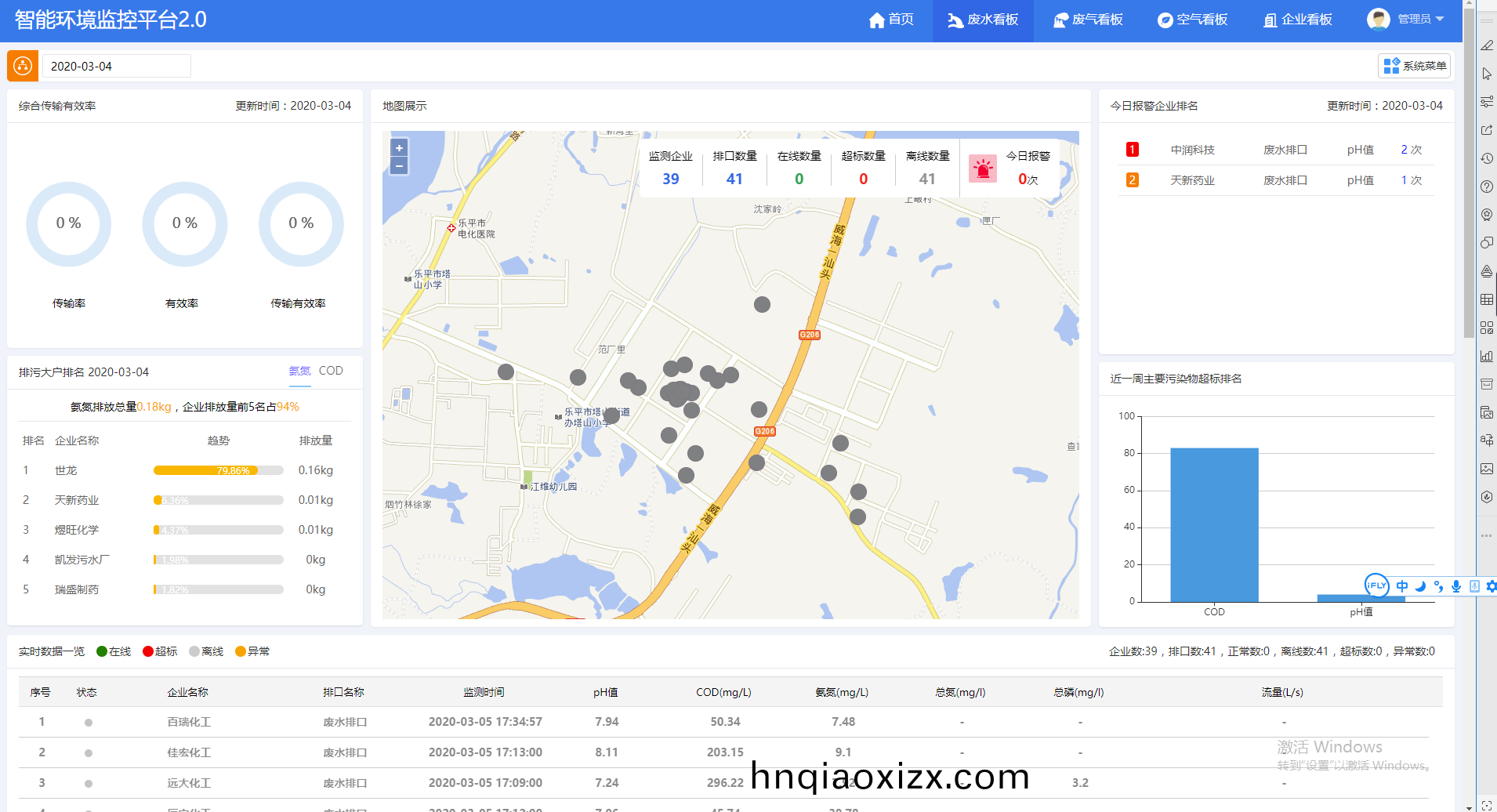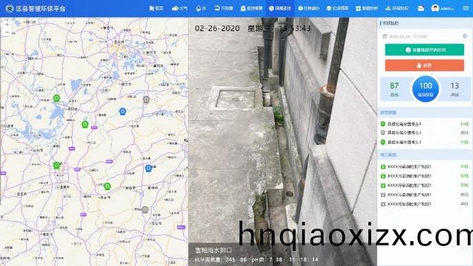 Panoramic display: Various environmental data are combined with location data to display the distribution of monitoring points, sewage discharge units, and alarm information in the form of a map.