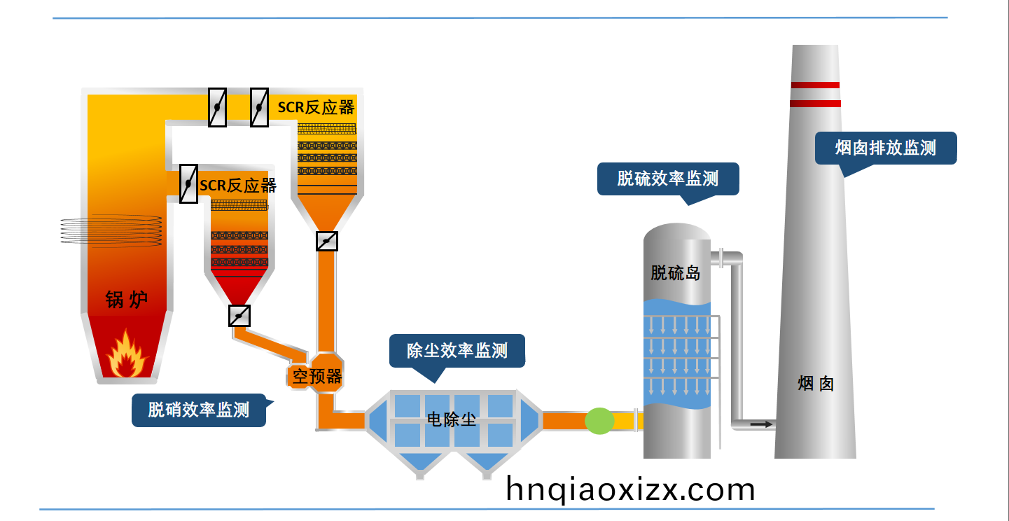 火電廠(chang)全工藝(yi)鏈監測,如脫硝傚率、除(chu)塵傚率(lv)、脫硫傚率、超低排放等監測。